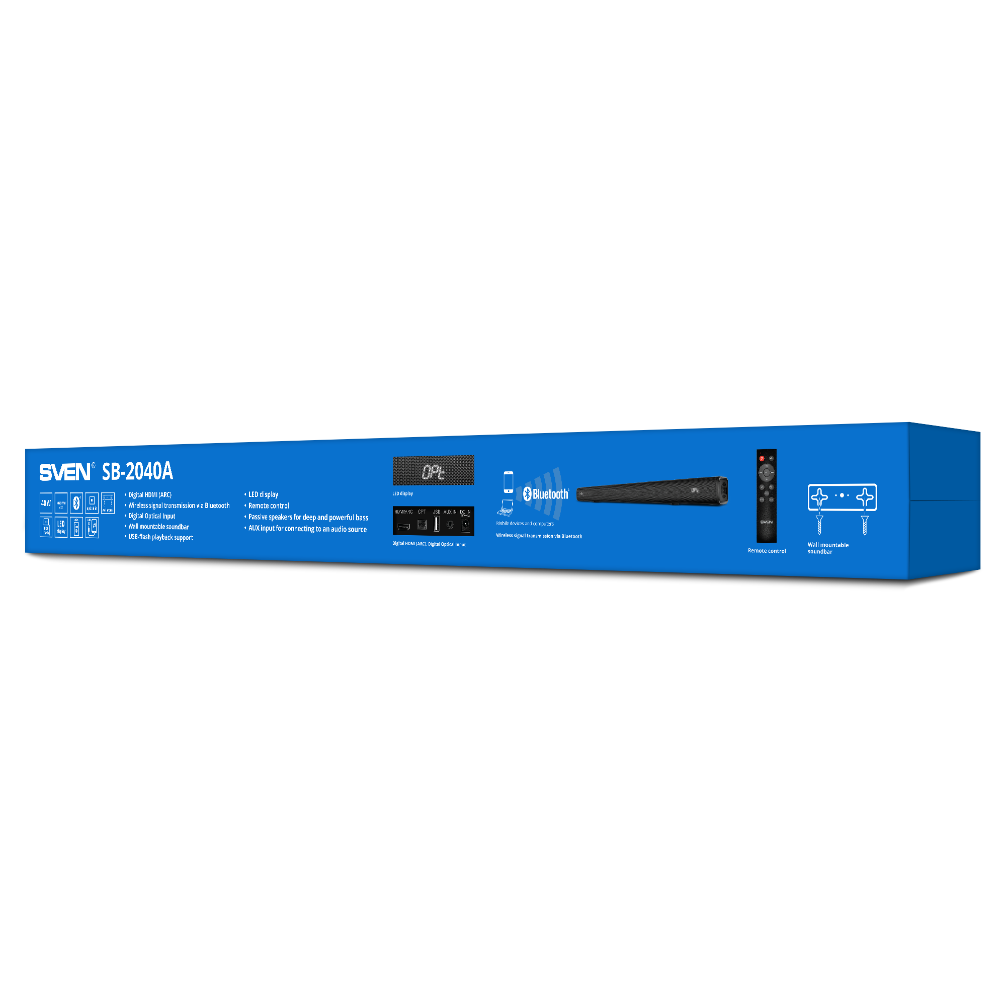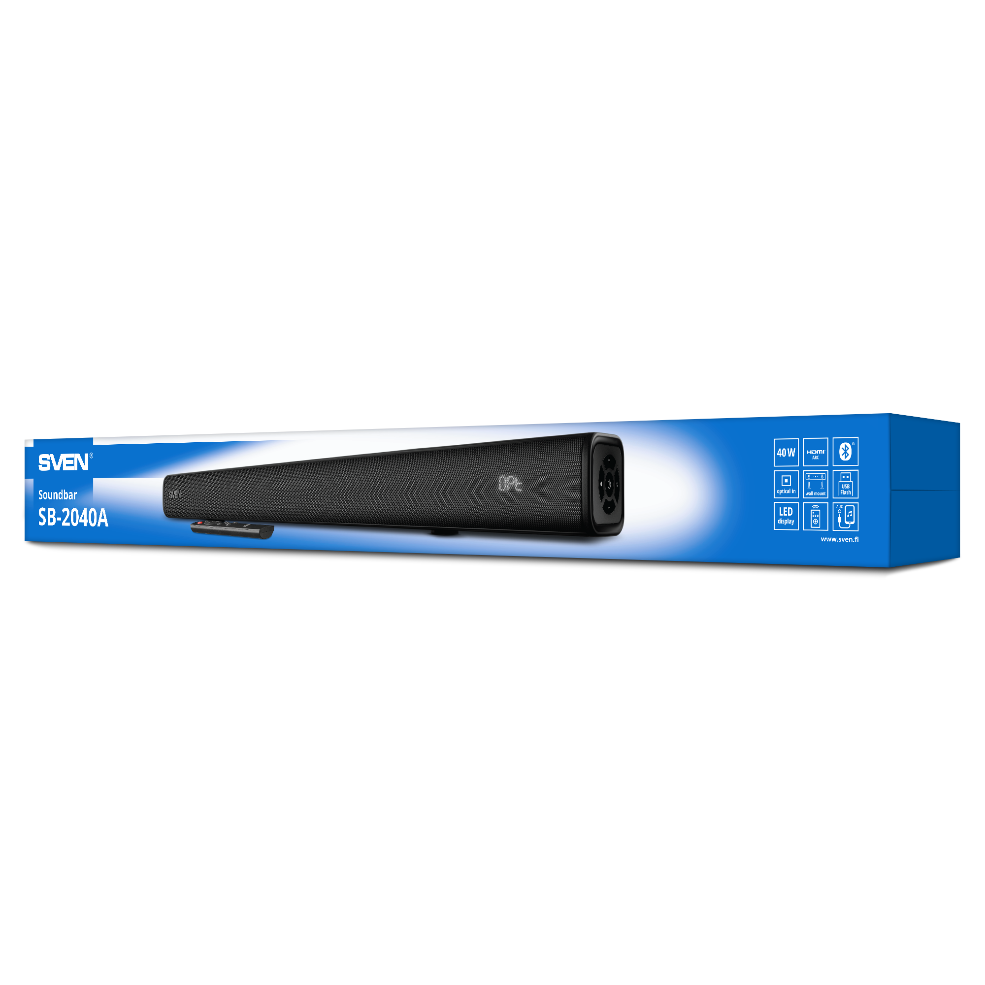 Саундбар от SVEN поднимет на новый уровень звук кино и спортивных трансляций, позволит с большим удовольствием слушать музыку. Управление саундбаром осуществляется с помощью удобного беспроводного пульта, также можно воспользоваться панелью, размещенной в одном из торцов устройства. Вся необходимая информация отображается на ярком и контрастном LED-дисплее, а строгий дизайн позволяет SB-2040A легко вписываться практически в любой интерьер.