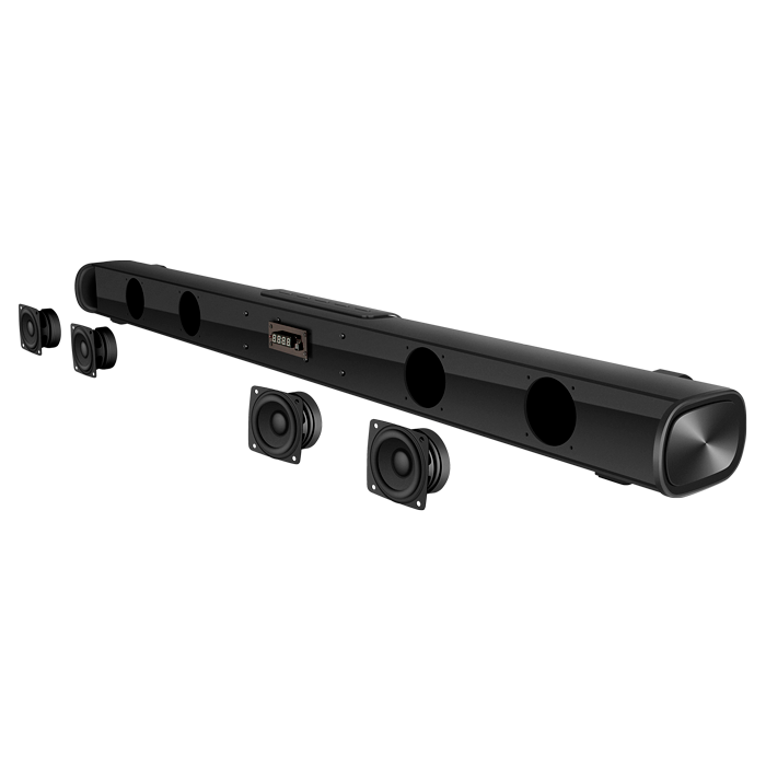 Общая мощность системы составляет внушительные 180 Вт — хватит для озвучивания даже большой гостиной, не говоря уже про комнаты поменьше. Крупный динамик сабвуфера диаметром 145 мм обеспечивает «басовую поддержку» в диапазоне от 50 до 150 Гц, а за воспроизведение средних и высоких частот отвечают целых четыре динамика диаметром 46 мм. Весь этот «оркестр» способен заметно расширить возможности телевизора, добавив новых красок в кинофильмы, игры, спортивные трансляции и другие программы.