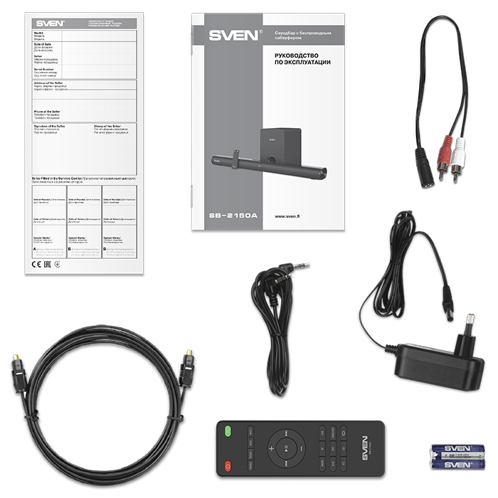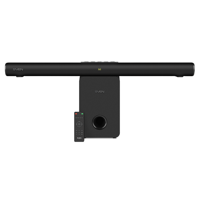 Создатели SVEN SB-2150A позаботились о том, чтобы использовать его было легко и приятно. Вся информация о работе отображается на LED-дисплее, управление осуществляется с помощью пульта ДУ. Не возникнет никаких проблем и с размещением комплекта. Сабвуфер оснащен беспроводным подключением, а саундбар может быть как установлен на полку рядом с телевизором, так и размещен на стене — все крепежные элементы есть в комплекте. Необходимые кабели пользователь также найдет в коробке с SVEN SB-2150A — дополнительно приобретать ничего не придется.