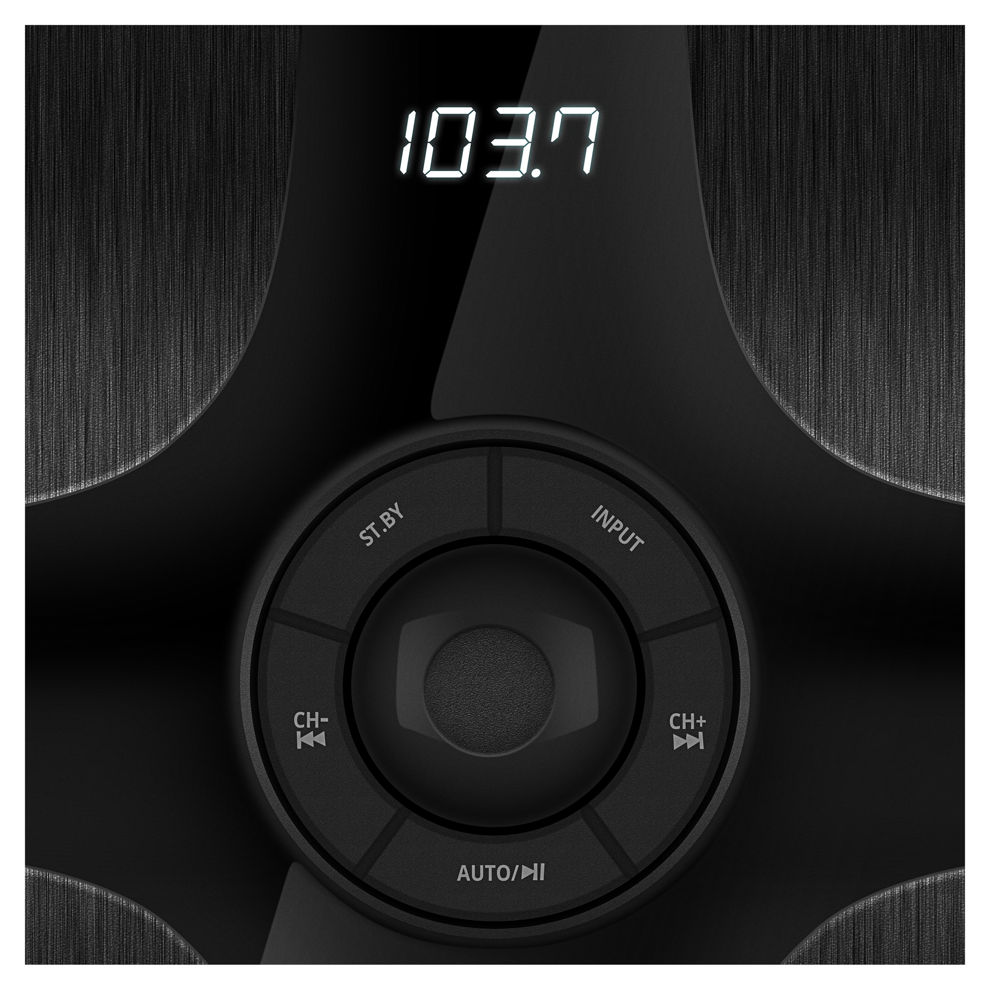 С громкостью тоже все в порядке, полная мощность акустики — 46 Вт. Этого с запасом достаточно не только для озвучивания рабочего места, но и для прослушивания музыки или просмотра кино в помещении среднего размера. Центральное устройство системы — это активный сабвуфер, на котором размещены панель управления с оригинальным дизайном в виде кольца и высококонтрастный LED-дисплей, снабжающий пользователя всей необходимой информацией. Любителей объемного баса порадует отдельная поворотная ручка его регулировки, которая позволит как добавить акцент на НЧ-диапазоне, так и сделать его более сдержанным при прослушивании музыки или в вечернее время, например.
