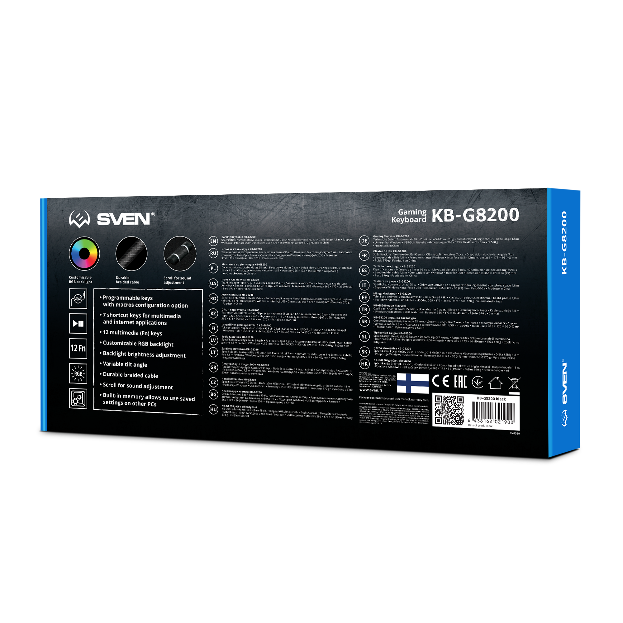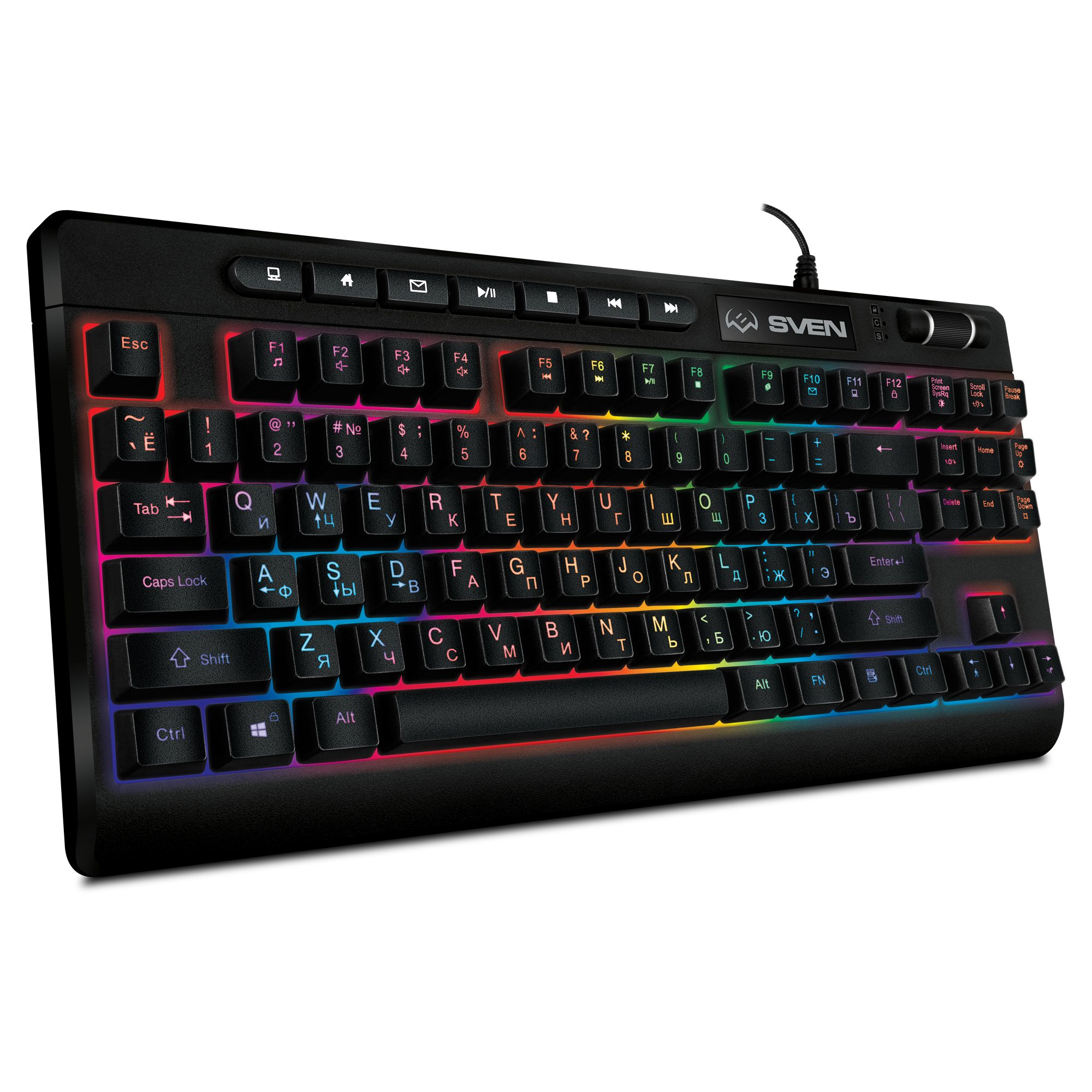 Игровая или офисная, для работы или развлечений? С клавиатурой SVEN KB-G8200 этот вопрос перестает быть актуальным, в ней есть все необходимое для повседневного использования в качестве игрового устройства, центра управления мультимедийными функциями ПК или выполнения рабочих задач. Внешний вид у клавиатуры строгий и даже лаконичный. Однако с помощью настраиваемой RGB-подсветки с регулировкой яркости ее внешний вид преображается и становится вполне характерным для геймерских устройств, являющихся важной частью оформления игрового пространства.