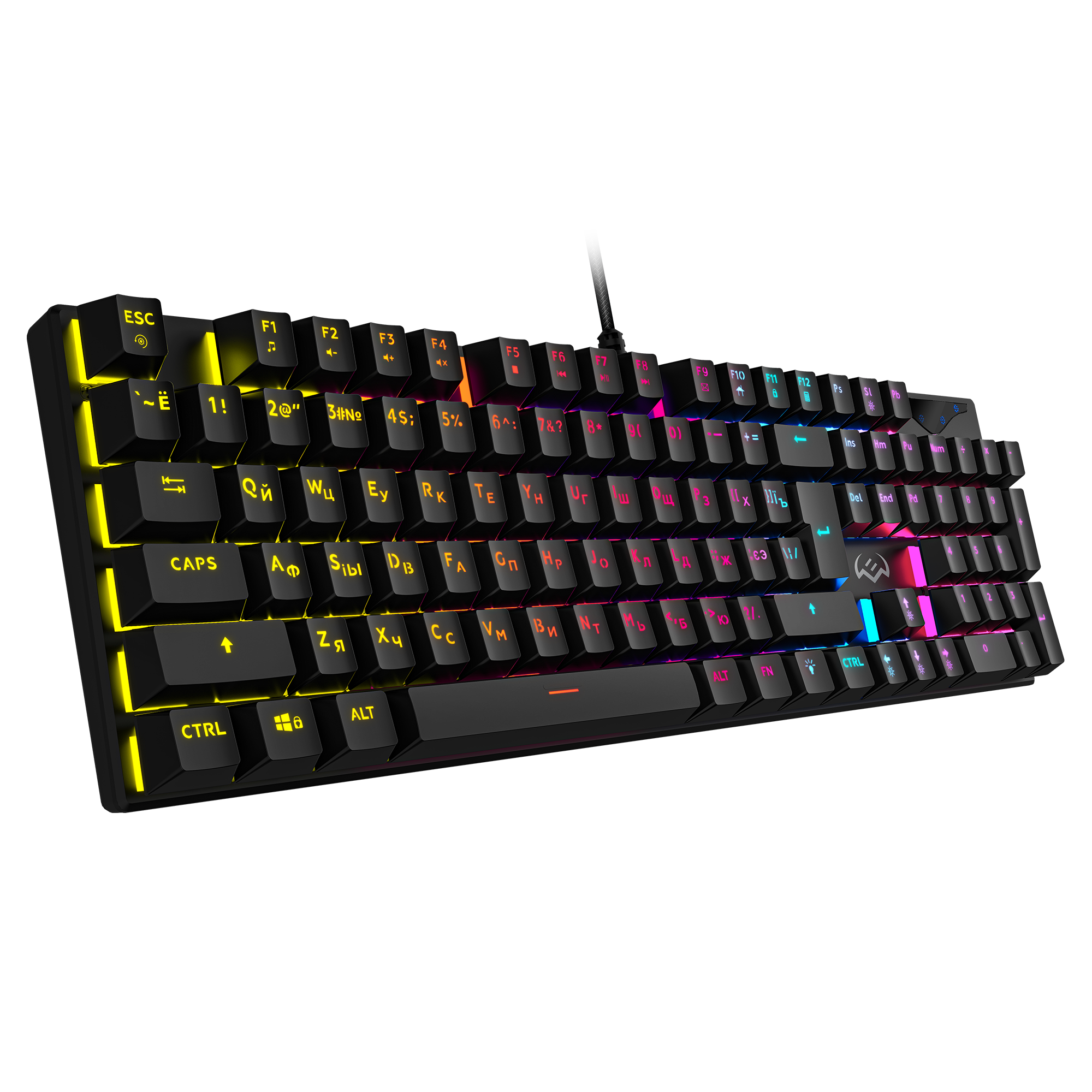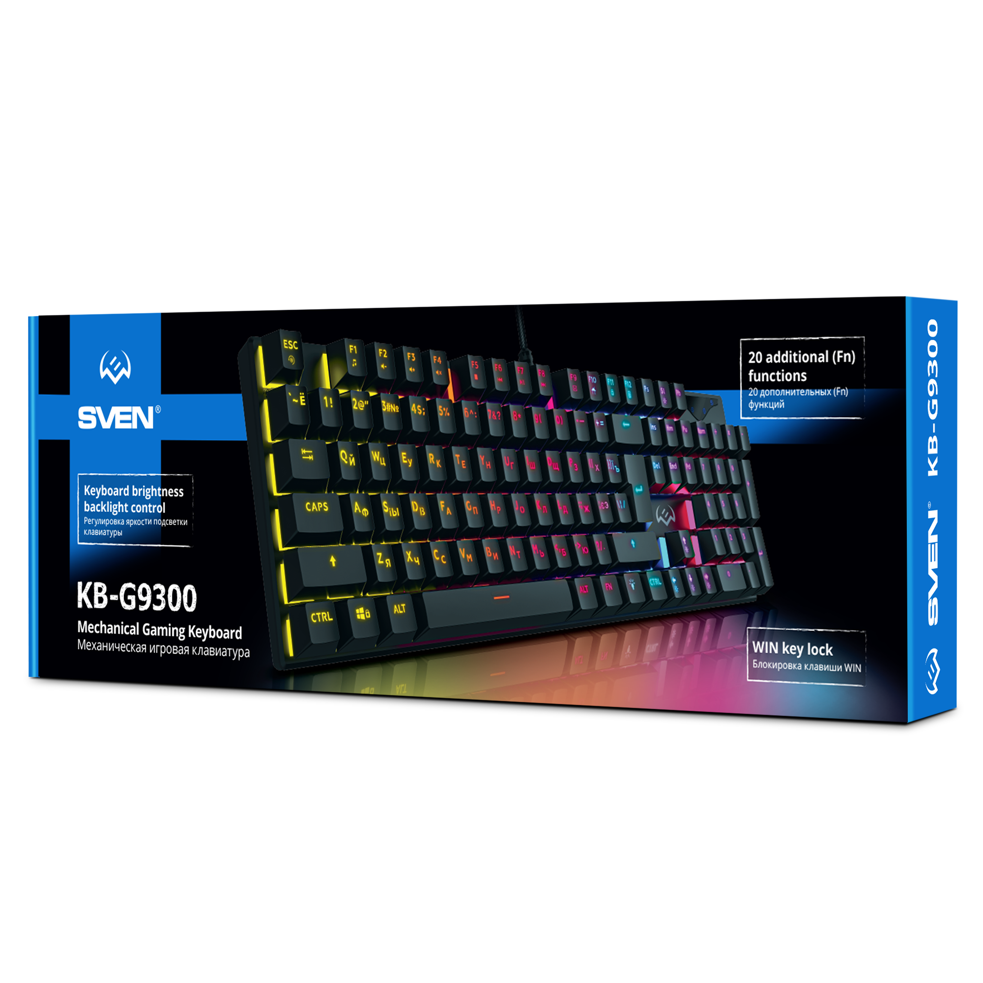 Целых 20 клавиш имеют дополнительные функции, активируемые кнопкой-модификатором Fn — от управления воспроизведением и громкостью до быстрого вызова самых необходимых программ. Игровой продукт практически немыслим без подсветки — есть она и у SVEN KB-G9300, причем разноцветная и с возможностью регулировки яркости, либо полного отключения. Блокировка клавиши Win спасет от неприятных неожиданностей во время игры — в общем, все необходимые киберспортсменам особенности присутствуют в полной мере.